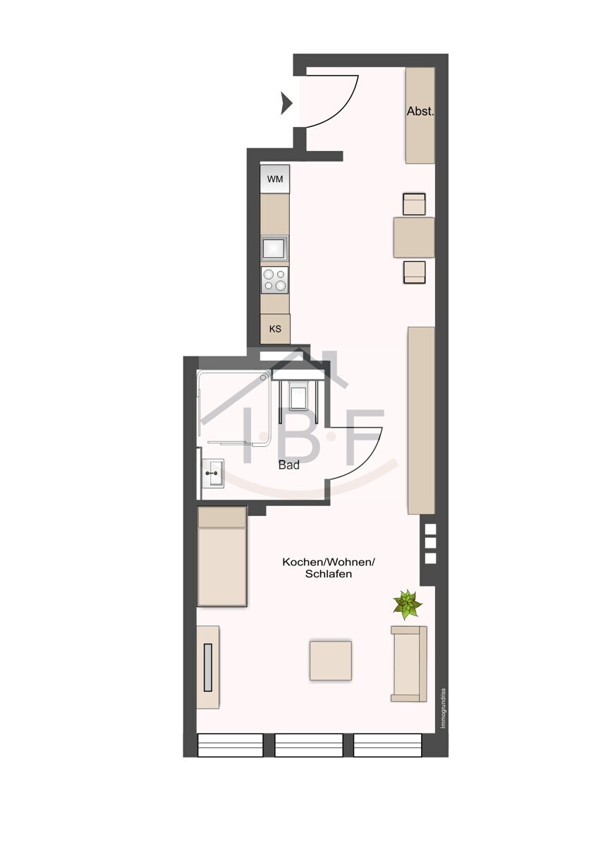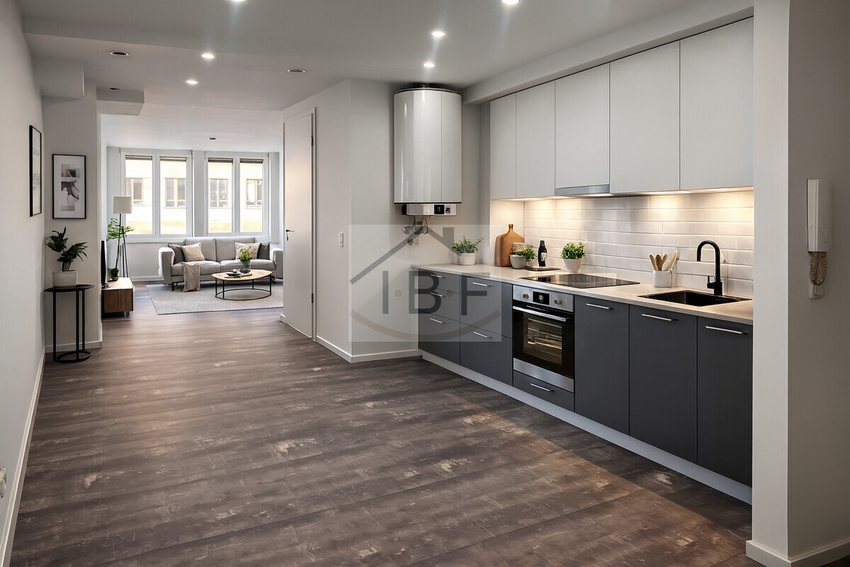 Die offene Raumgestaltung, bei der die Küche harmonisch in den Wohn- und Schlafbereich übergeht, schafft ein beliebtes und effizient nutzbares Wohnambiente – ein entscheidender Vorteil für eine nachhaltige Vermietbarkeit.