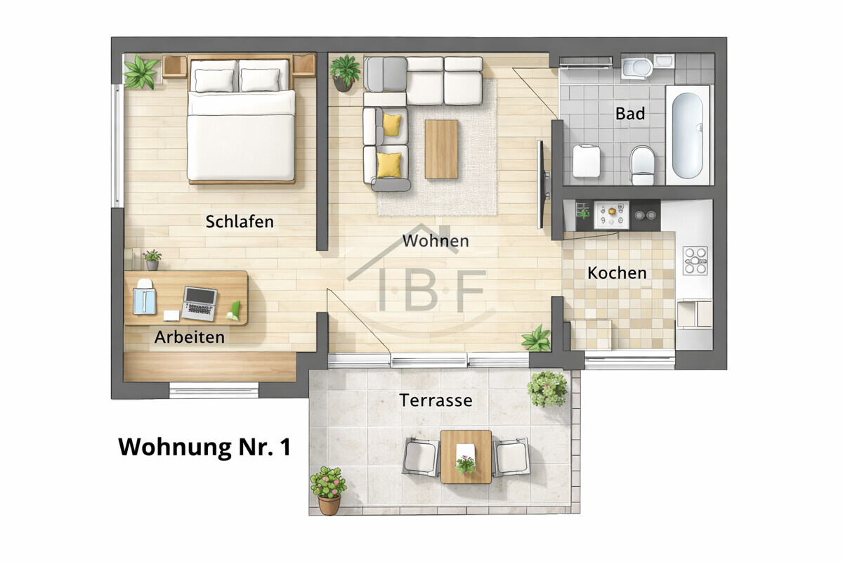 Diese gepflegte 2-Zimmer-Wohnung mit einer Wohnfläche von ca. 46 m² bietet eine attraktive Gelegenheit. Die durchdachte Raumaufteilung schafft ein angenehmes Wohnambiente. Der Wohnbereich mit Zugang zur Terrasse erweitert den Lebensraum ins Freie und steigert die Wohnqualität deutlich. Ergänzend steht den Bewohnern ein Gemeinschaftsgarten zur Verfügung, der zusätzlichen Erholungsraum bietet. Ein separater Kellerraum sorgt für praktischen Stauraum. Die Warmwasserversorgung erfolgt über einen Durchlauferhitzer.